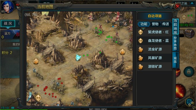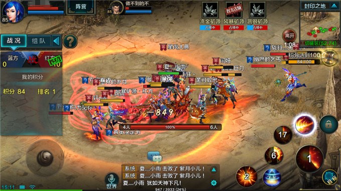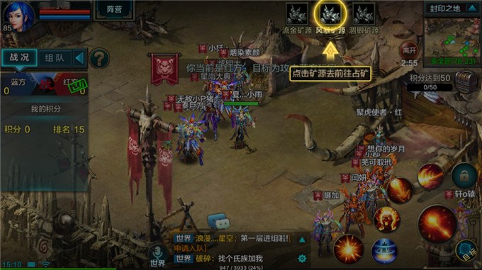 1、封印之地内分为盘龙(蓝方)和聚虎(红方)两个阵营,玩家随机进入一个阵营,当匹配到30人时便可开始争夺。在封印之地中有三个矿源,玩家所需要做的是在矿源中站得足够久,顺便清掉敌方玩家。