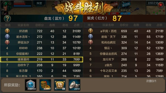 玩家每击败一个敌方拿到10点个人积分,助攻拿到1点个人积分,当获得50积分后便可得到银宝箱,100积分可以领取金宝箱;封印之地结束后会按照战场内的个人积分排名发放奖励。