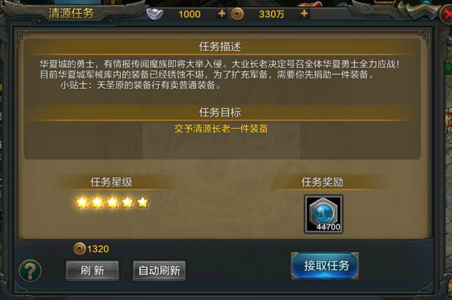 清源任务可从清源长老处接取,共分为五环。每环可获得的经验会依次提高,而每一环又有五个星级,五星才是最高经验的任务。想当年为了一个五星任务,刷破产的英雄也不在少数……