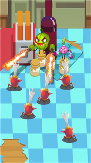 玩家将会成为这只胡萝卜,去拯救其他的蔬菜水果。这时候厨房里的刀叉就成为他们的敌人。
