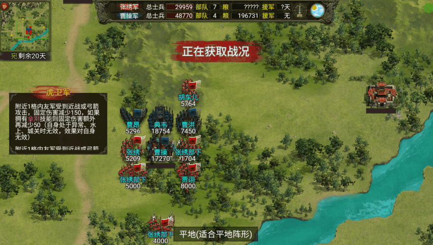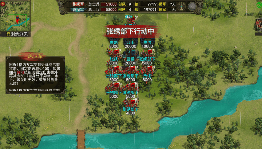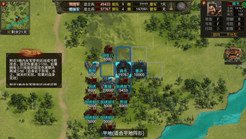 技能解析:虎卫军的光环效果触发等级更低,满级时可为佩戴部队提供30的攻击加成、12的防御加成和12的弓防加成。当主帅为许褚或典韦时,友军在分摊伤害时有20%的几率只受到1点伤害(不会溃散),这一点在战斗中至关重要!
