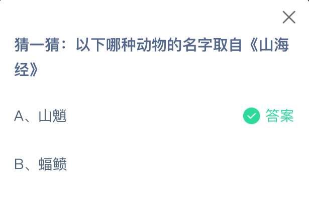 总结以上就是关于“猜一猜以下哪种动物的名字取自《山海经》”的内容,支付宝蚂蚁庄园2025年7月8日的答案最新,更多精彩内容,请关注我们的更新!