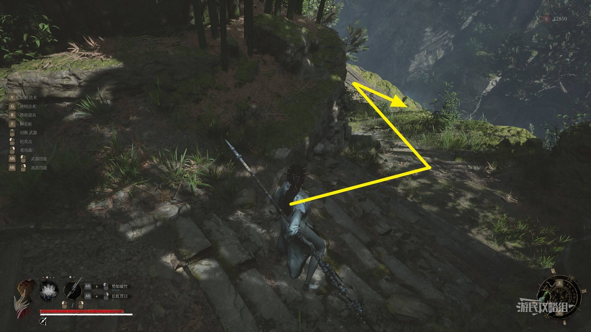 穿过这座房子后,前方会看到一个楼梯,上面有一个推巨石的远程小怪,注意躲避,朝着远程小怪的方向走。