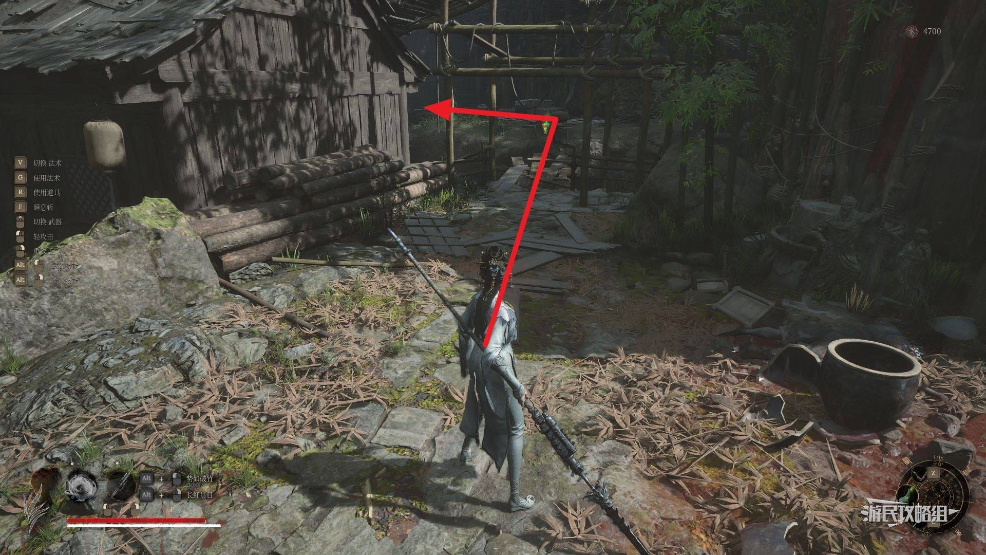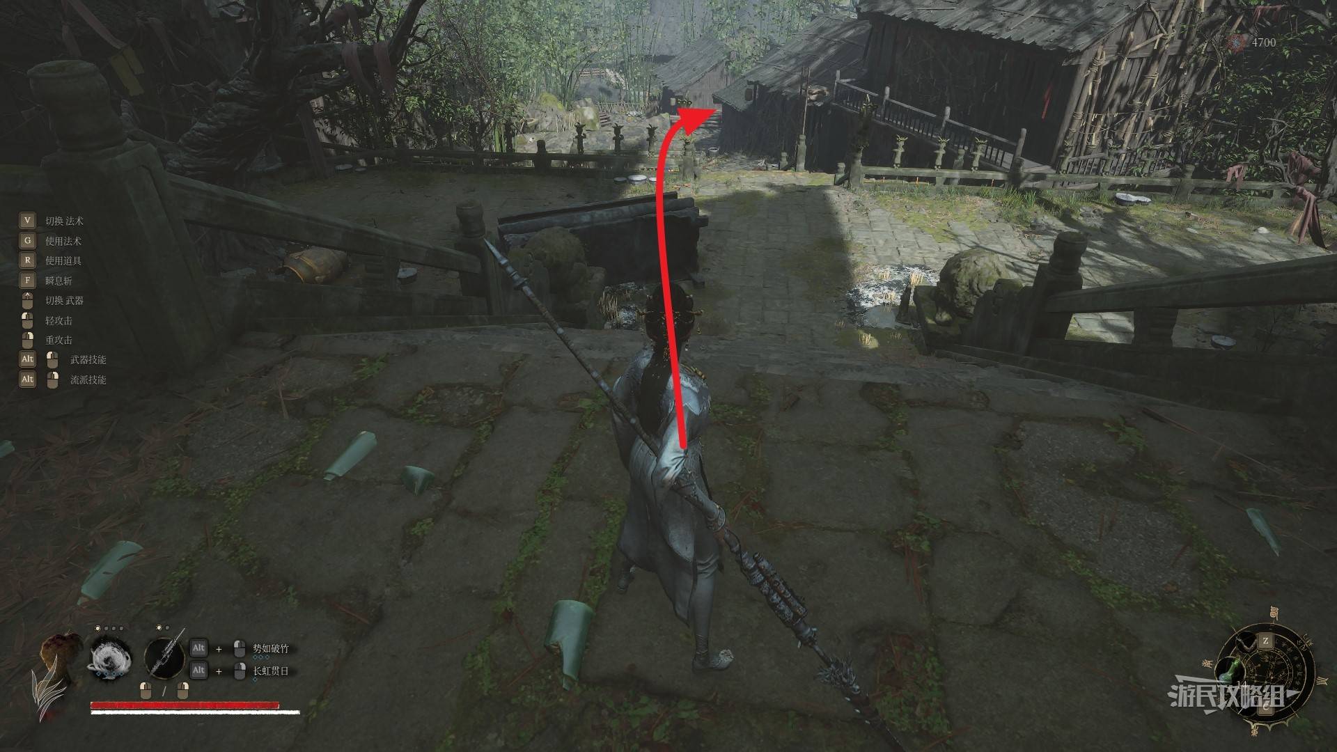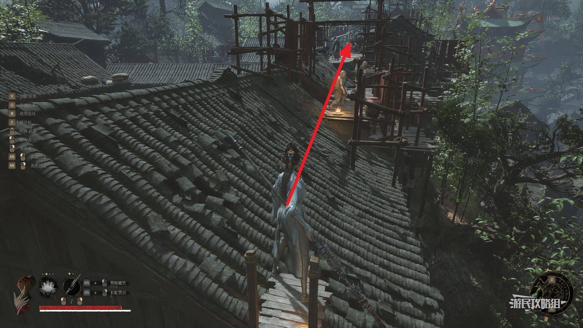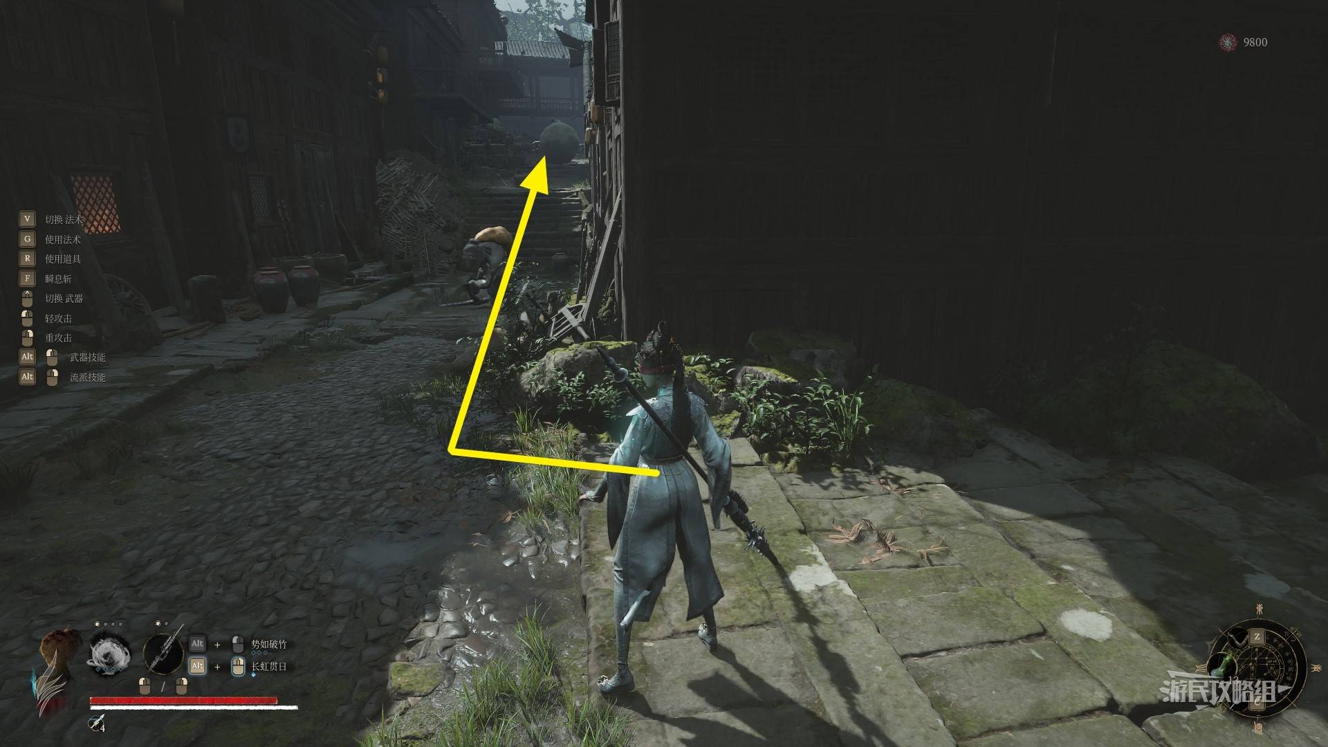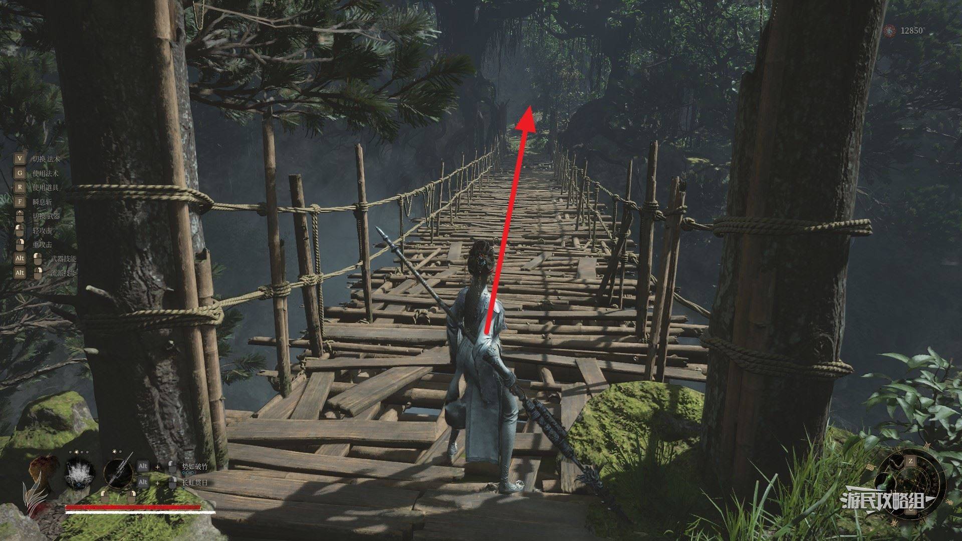 在右侧门外,有一座隐形桥,直接过桥后向左走。小心左边小道屋门里的阴人小怪,记得及时闪避。