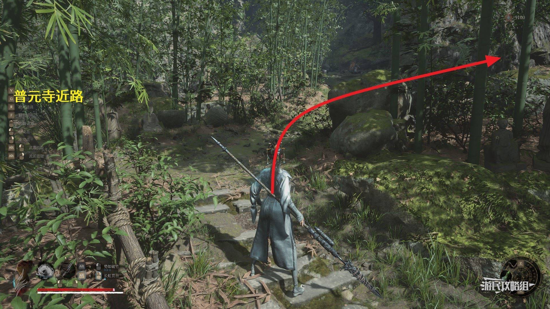 从【佛源镇-蜀王祠】的神龛出发,首先从蜀王祠的正门离开,下台阶回到之前与红眼明军交战的地方,往右侧看去。