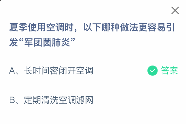 1、夏季使用空调时,以下哪种做法更容易引发"军团菌肺炎"?