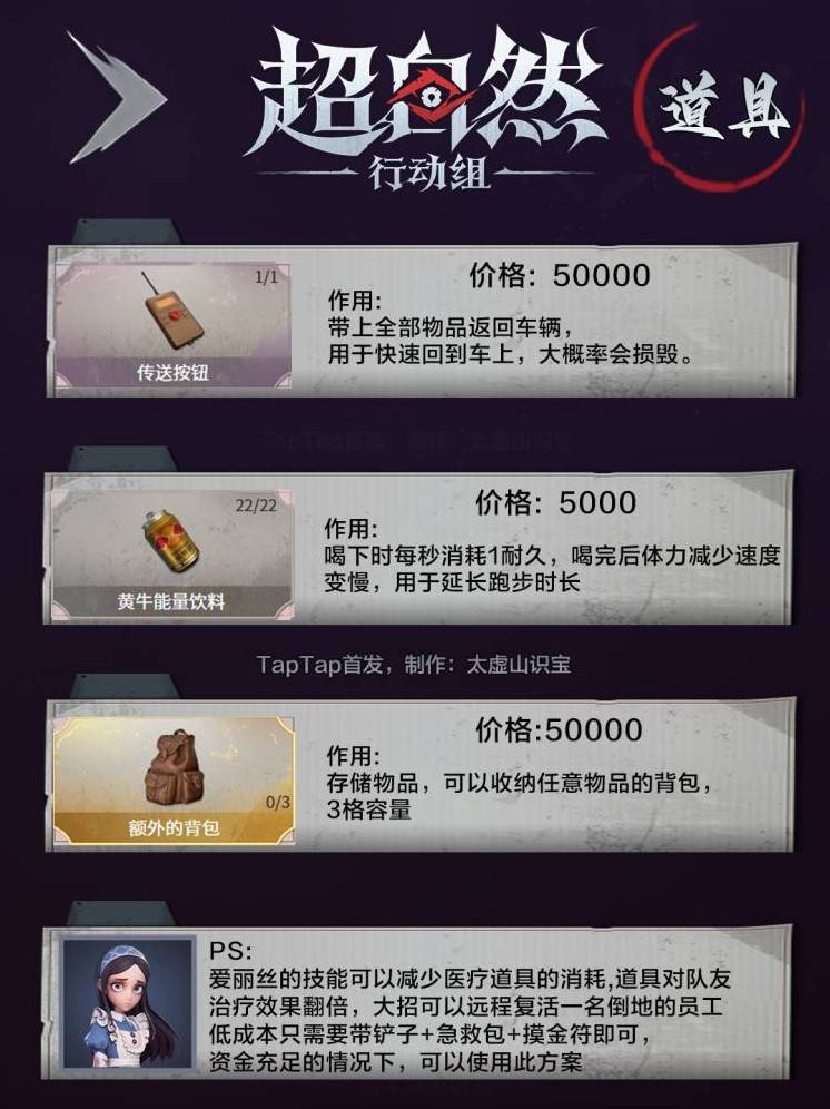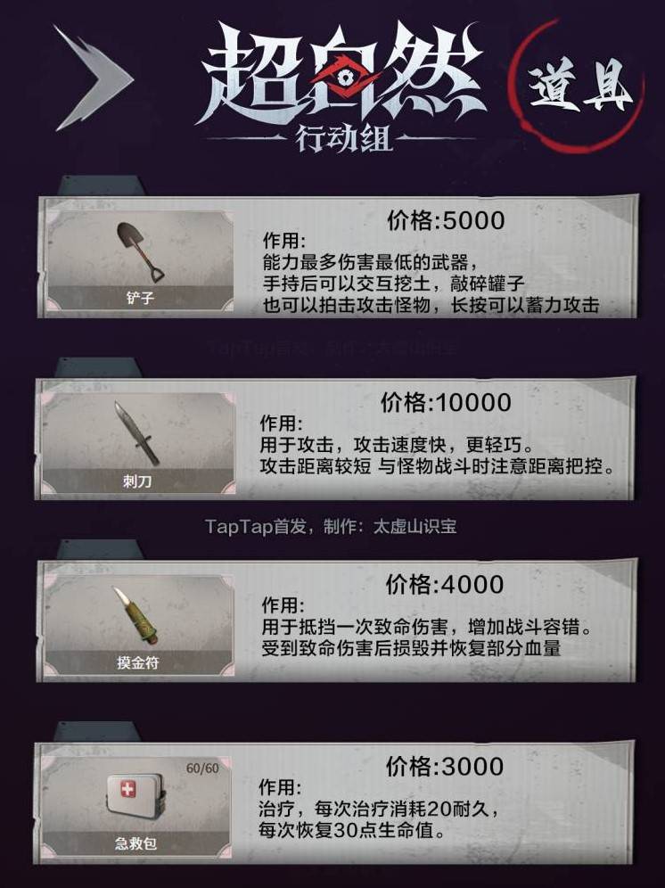 铲子:不仅可以用来攻击敌人,还能进行交互,挖土寻找资源。 急救包:是回血的必备道具,能帮助你在关键时刻恢复生命值。 摸金符:提高容错率,让你在面对危险时有更多的生存机会。 黄牛饮料:延长跑步时长,帮助你在逃跑时更加从容不迫。 传送按钮:可以快速回城,避免不必要的损失。 额外背包:增加收纳容量,让你在探索时收集更多的物资。如果你的资金有限,最低配置可以选择铲子、急救包和摸金符这三样,性价比极高。而如果你有足够的资金,建议全面提升装备,以增强生存能力。