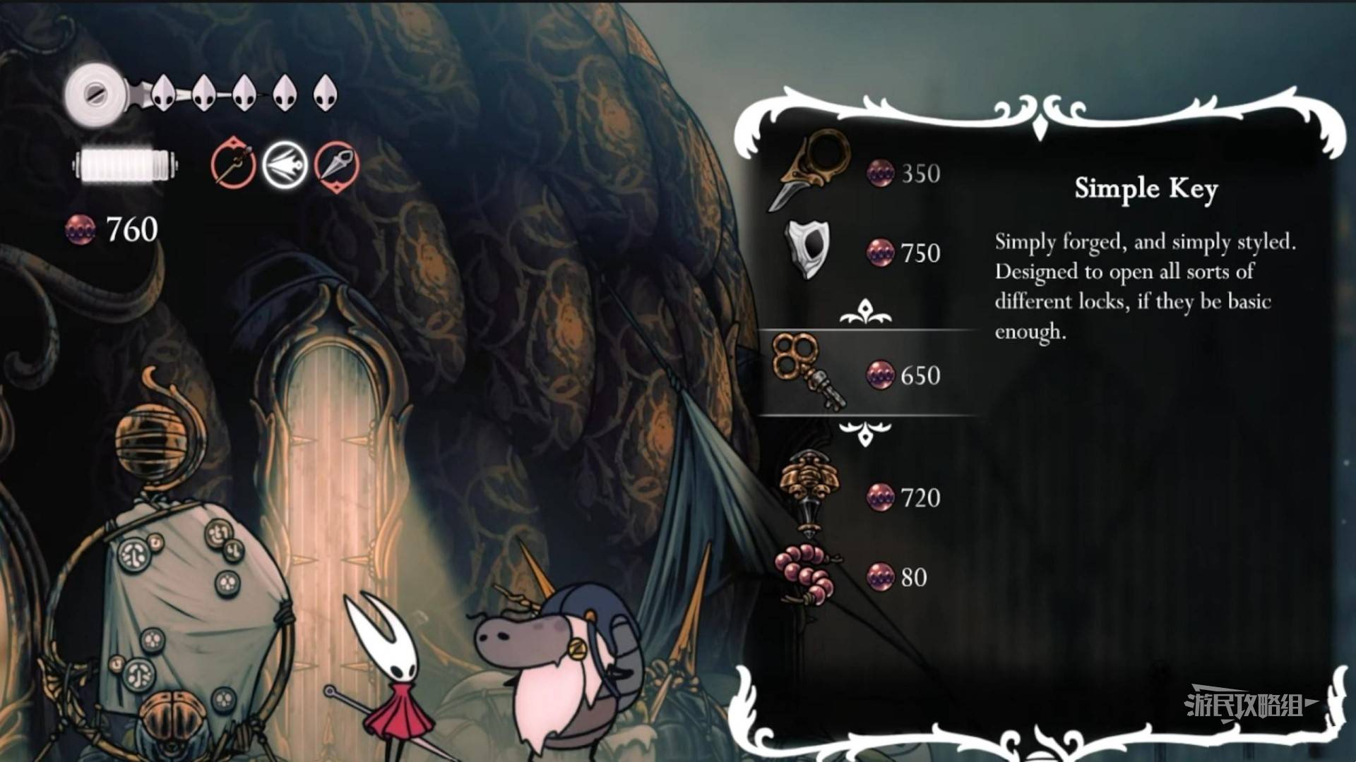 第一把钥匙可以在骸底镇的商人处,花费500念珠购买。这位商人就像游戏中的一个小宝藏,提供了不少实用的道具。