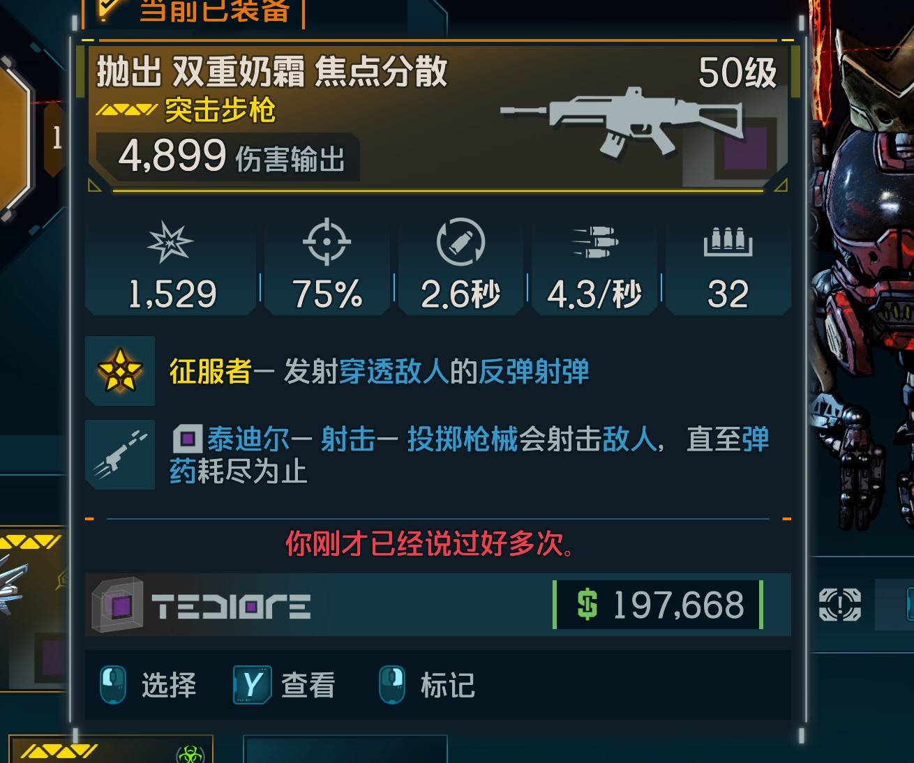 这把突击步枪是我个人的最爱,虽然射速较低,但在实际战斗中,手感却相当不错。它的特殊效果是开镜时造成双倍伤害,但同时也会消耗双倍弹药,射速减少一半。开镜的手感极佳,几乎可以将其用作突击步枪和狙击枪的双重选择。虽然腰射表现略逊一筹,但后期的伤害依然可观,似乎还有几率发射两发子弹!这把武器从开荒到秘藏5都能派上用场,综合评价给到9分。
