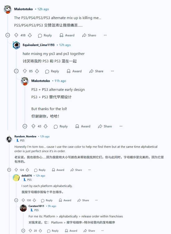 “说实话,我也有点犹豫……我通常用游戏盒的颜色来找游戏,但按字母顺序排列才是王道,因为这样更有序。”