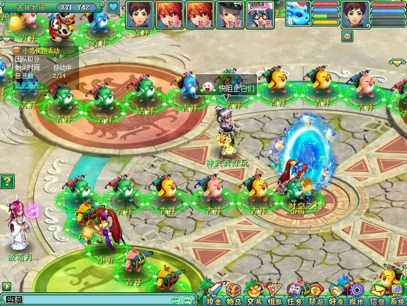 萌宠吉祥争先冲向时空之门,五人合力半路拦截!小鸡快跑活动开启,创新祖玛玩法感受不一样的热闹场面。五颜六色的吉祥涌向时空之门,玩家需要策略配合,让同颜色的吉祥发生碰撞消除,连续消除的越多积分奖励越多。