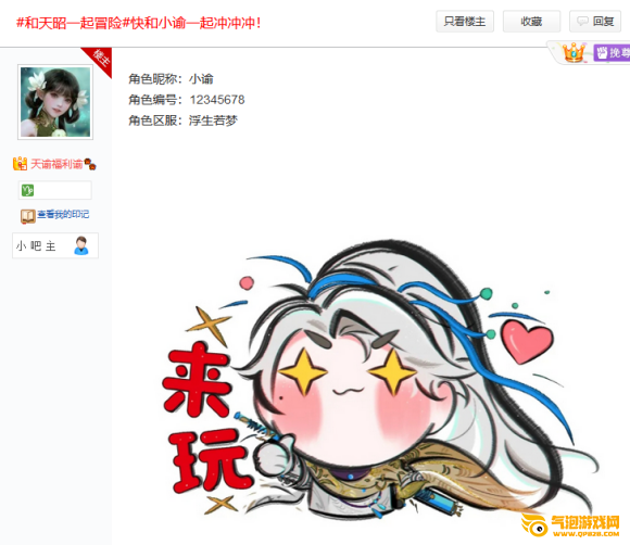 #和天昭一起冒险#话题标签发布主题帖,在一楼中留下自己的角色编号等信息,并将主题帖链接回复至本帖视为成功参与。