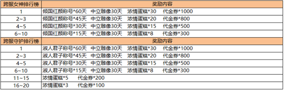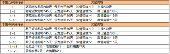 4、本服前10名女神将进阶跨服决赛(分QQ/微信两大战区)本服、跨服前十大女神都将获得丰厚奖励道具。本服、跨服前二十大守护者也同时获得丰厚奖励。