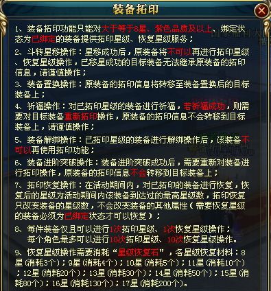 1)截止4月4日,玩家可在王城"拓印大使(613,547)"处对大于等于8星的紫色装备进行拓印星级,恢复星级服务,具体规则如下图: