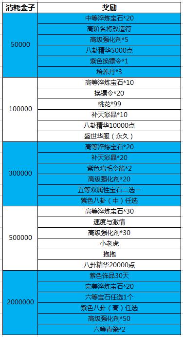 各服务器内每日消耗排行榜排名第1且达到200000金子:可获得道具:高级名将改造符*10+培养丹*5+豪华盛典礼包一个(礼包可交易)