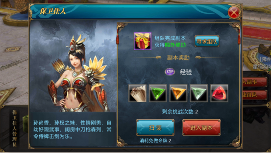 保卫佳人,佳人就是孙尚香,任务完成方式为防守进度条至99%,随后刷新最终boss:采花大盗田伯光(有一种武侠大片的既视感),怪物等级与队长等级一致,每天可挑战两次,每次副本平均用时三分半。通过王城保卫佳人管理员进入副本。