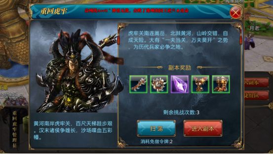 重回虎牢副本奖励为绿色普通品质人装与紫色晶石,每日限进入副本三次。通过重回虎牢管理员进入副本。重回虎牢副本的地图即是游戏当中的阳平关地图,玩家需要击杀面前拦路的小怪,到达图中所示的红圈位置,那是本关第一个boss[行刑人]的所在地,击杀行刑人后即可南下,向本关最终boss[黑甲将军]处前进。