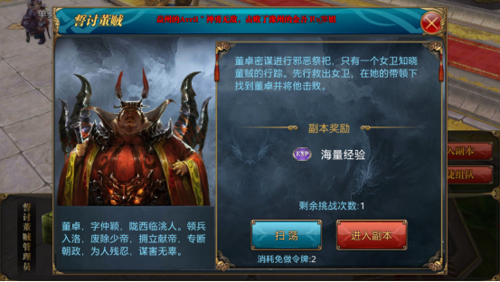 誓讨董贼的奖励为经验奖励,组队参与副本还可获得额外的经验丹奖励,每日可参与两次,